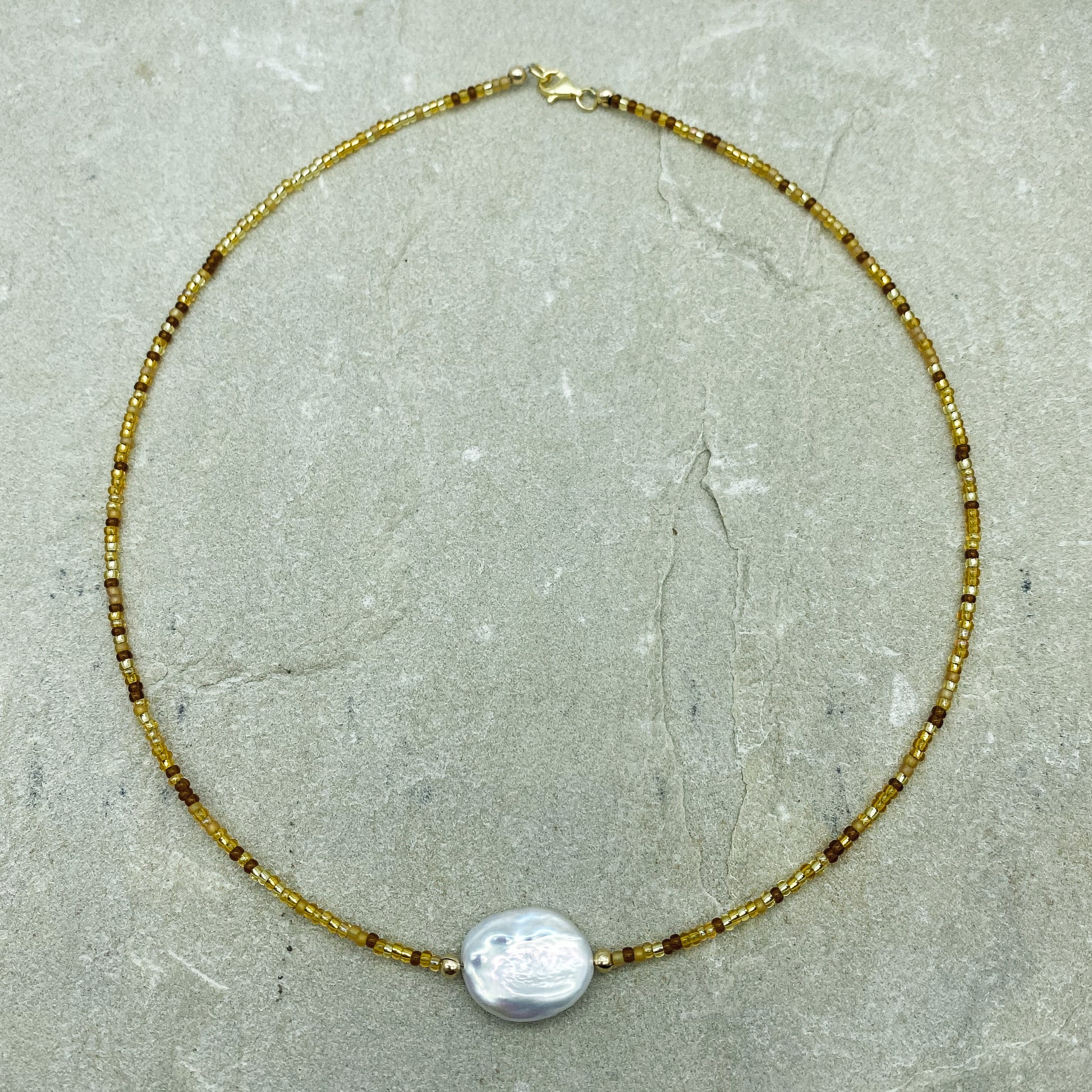 Adorn your neck with the Alize - Pearl Beaded Choker, where Czech beads meet a sassy freshwater pearl pendant! Crafted with gold plated sterling silver findings, this choker serves up elegance with a side of whimsical.