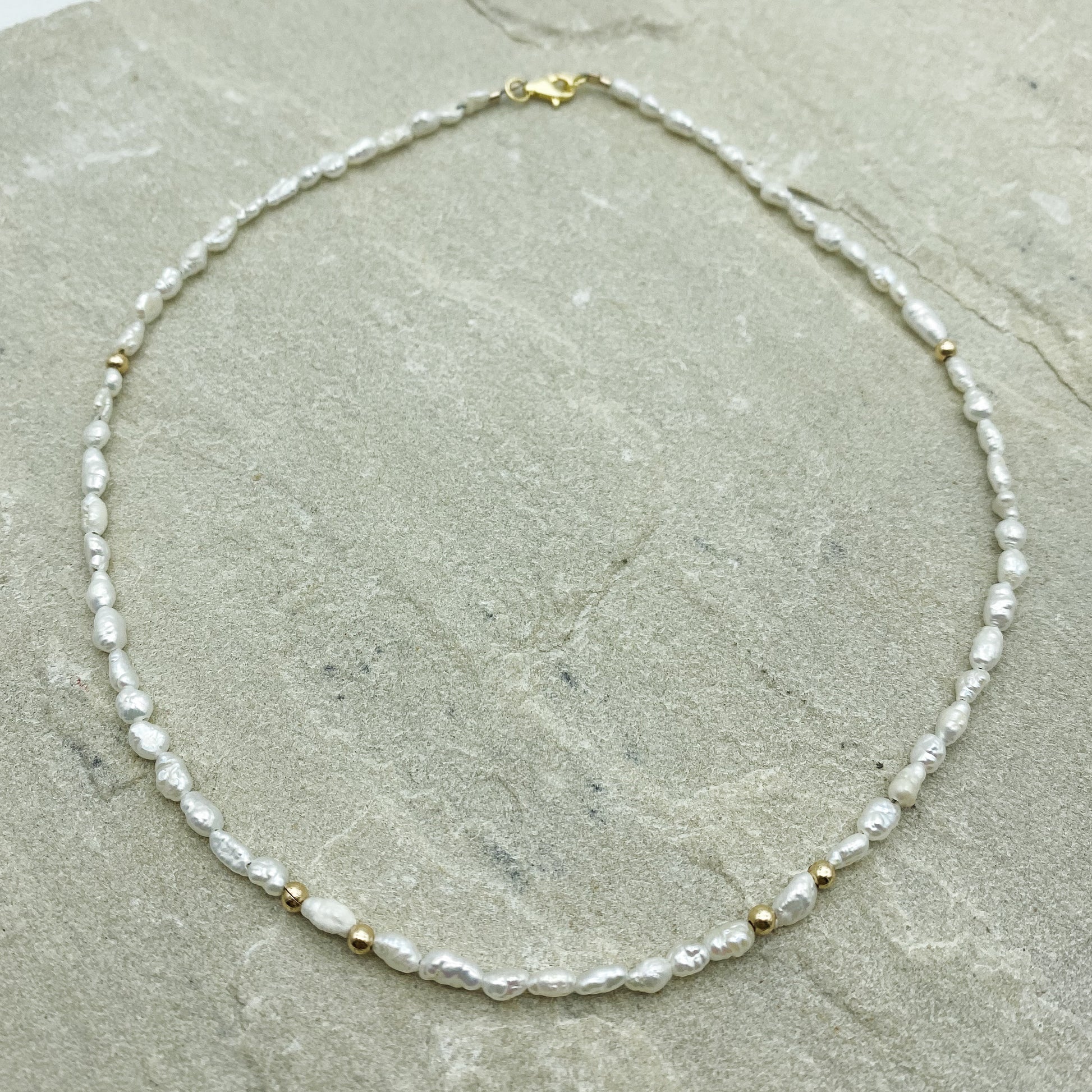 This beautiful necklace features freshwater rice pearls and is plated with 18k gold. Elevate your look with this delicate and elegant piece, perfect for any occasion.