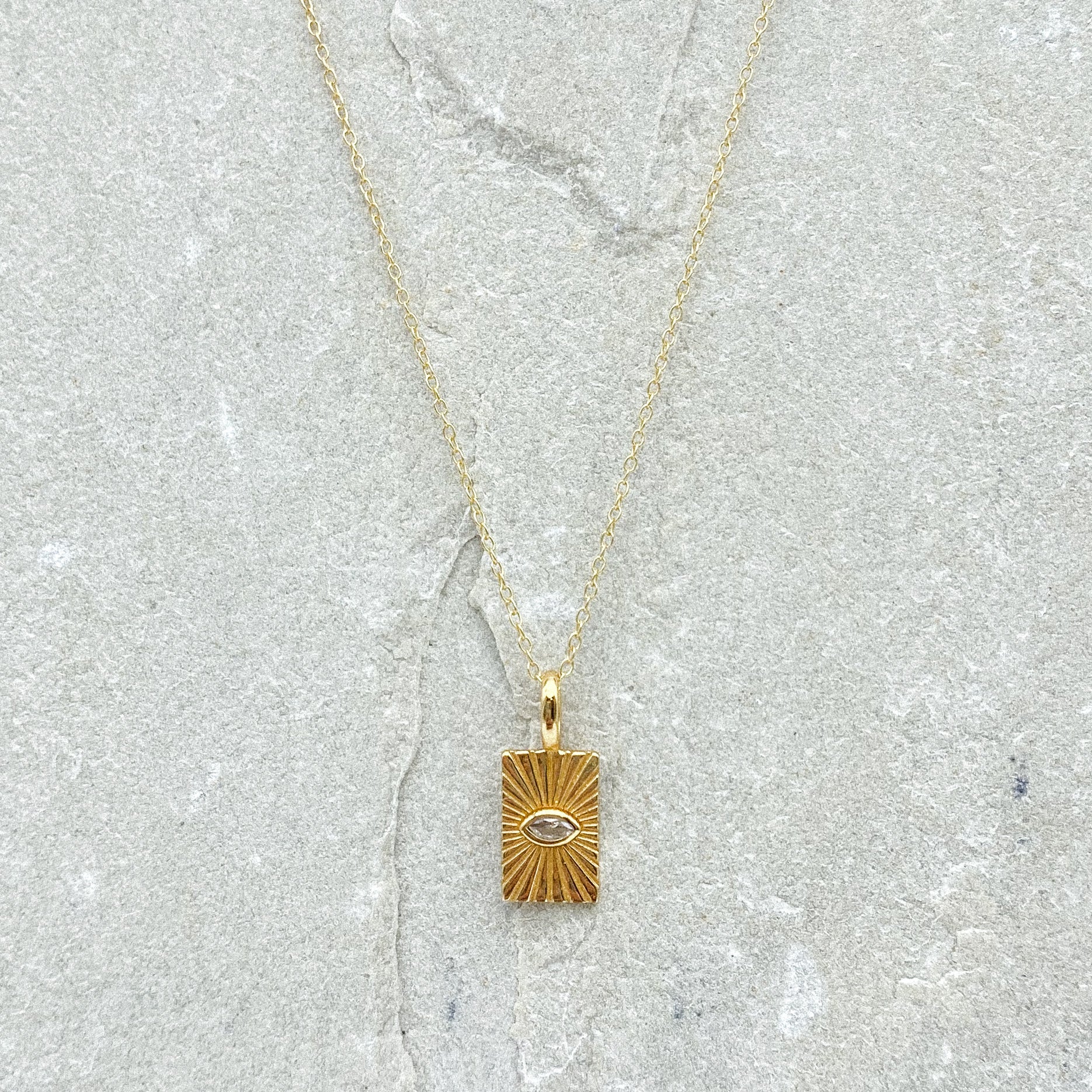 "Add a touch of celestial sparkle to your outfit with the Celeste necklace. Made with 925 sterling silver and plated with 18k gold, this necklace shines with high-quality cubic zirconia. The perfect gift for any occasion."
