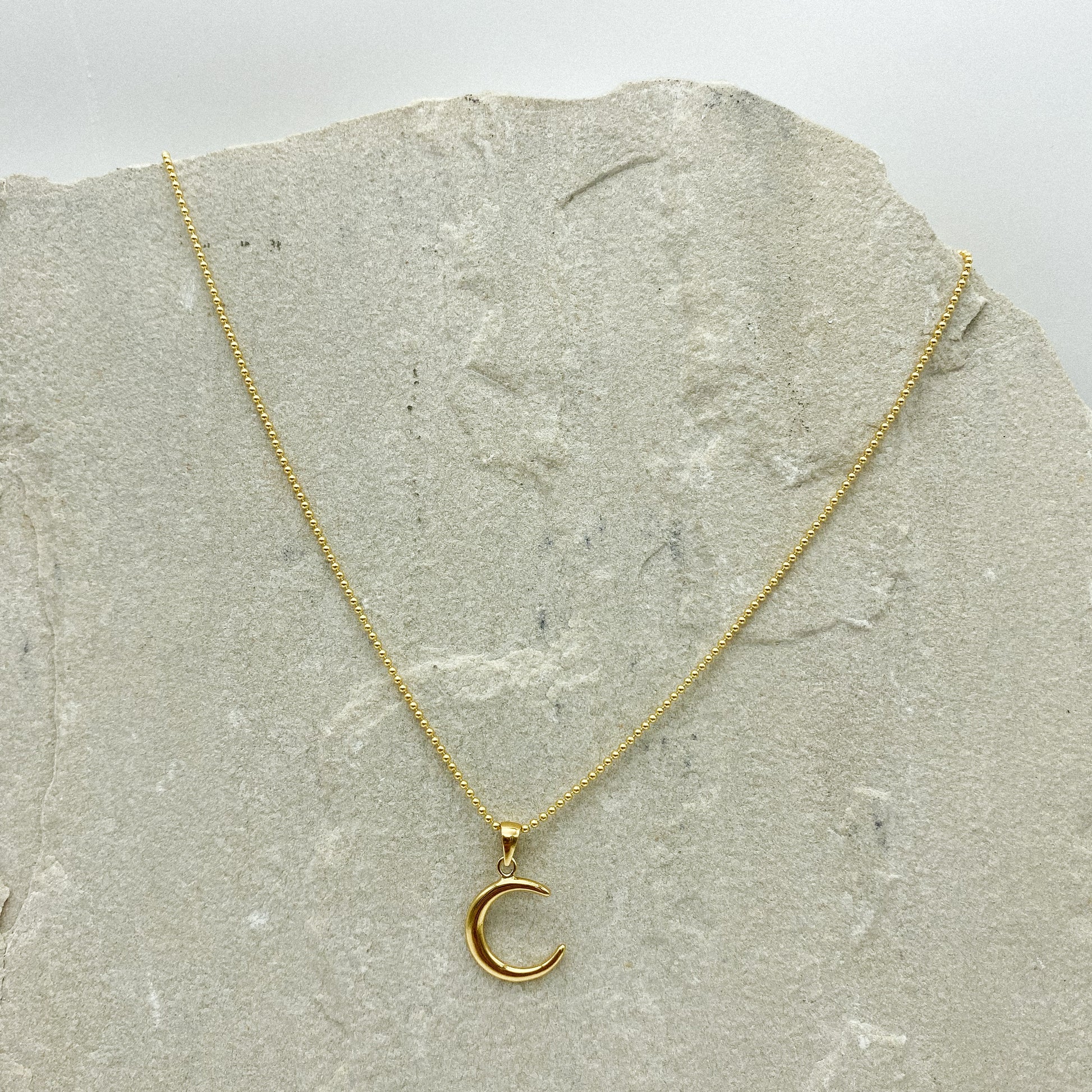 Our crescent moon necklace is a base of 925 Sterling Silver and 18k gold plated. It features an adjustable ball chain 16”-17”.